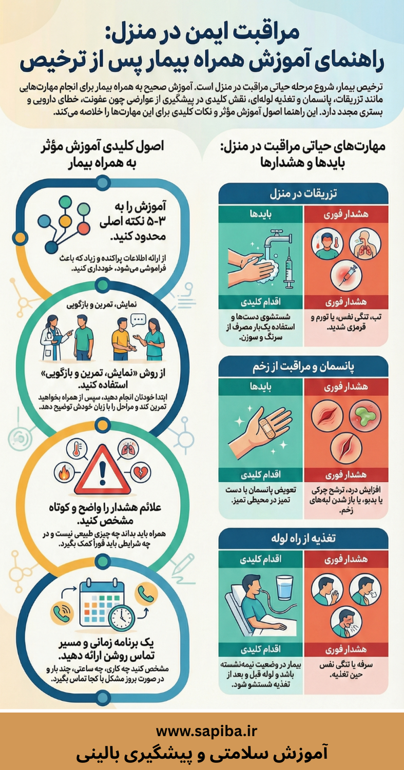 راهنمای عملی آموزش همراه بیمار برای مراقبت ایمن در منزل پس از ترخیص: از تزریق تا پانسمان و تغذیهٔ لوله‌ای